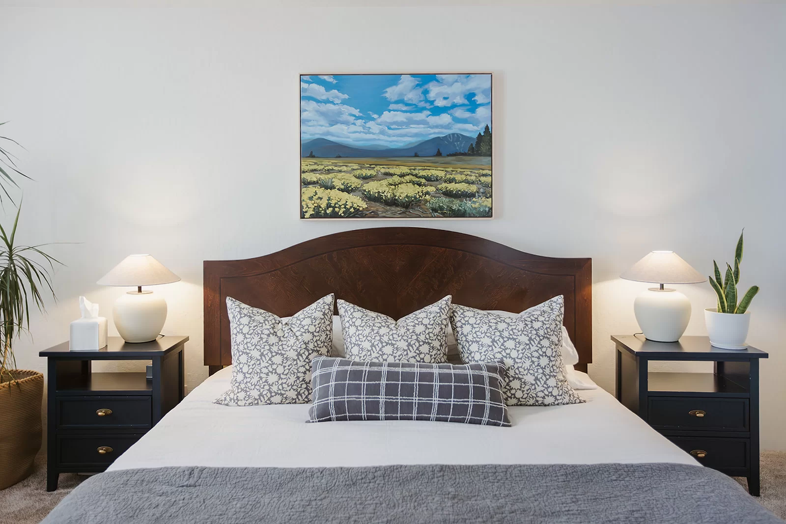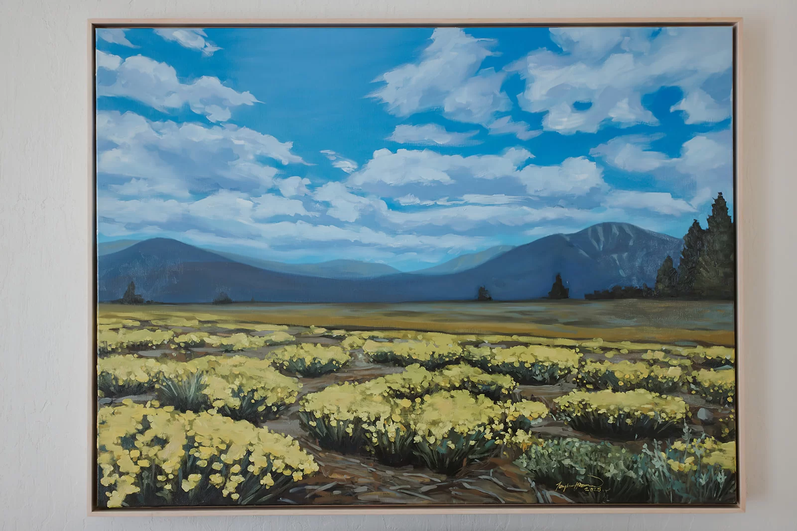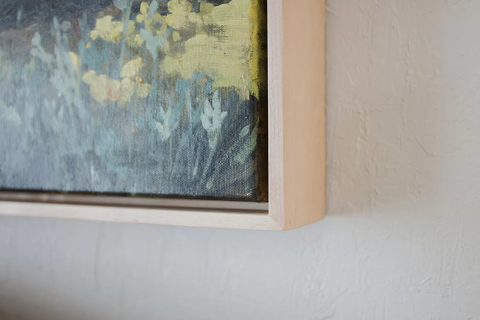 This painting is framed in a solid maple float frame. The frame measures 31x41x2.25 inches.